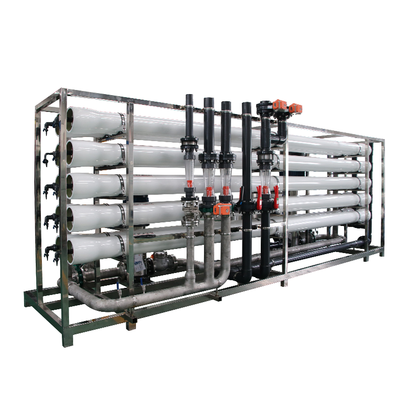 反渗透设备采用反渗透的渗透过滤工艺,是一种现代新型的纯净水处理技术。反渗透借助于选择透过(半透明)性膜的功能以压力为推动力的膜分离技术,当系统中所加的压力大于进水溶液渗透压时,水分子不断地透过膜,经过产水流道流入中心管,然后在一端流出水中的杂质,如离子、有机物、细菌、病毒等,被截留在膜的进水侧,然后在浓水出水端排出,从而达到分离净化目的。